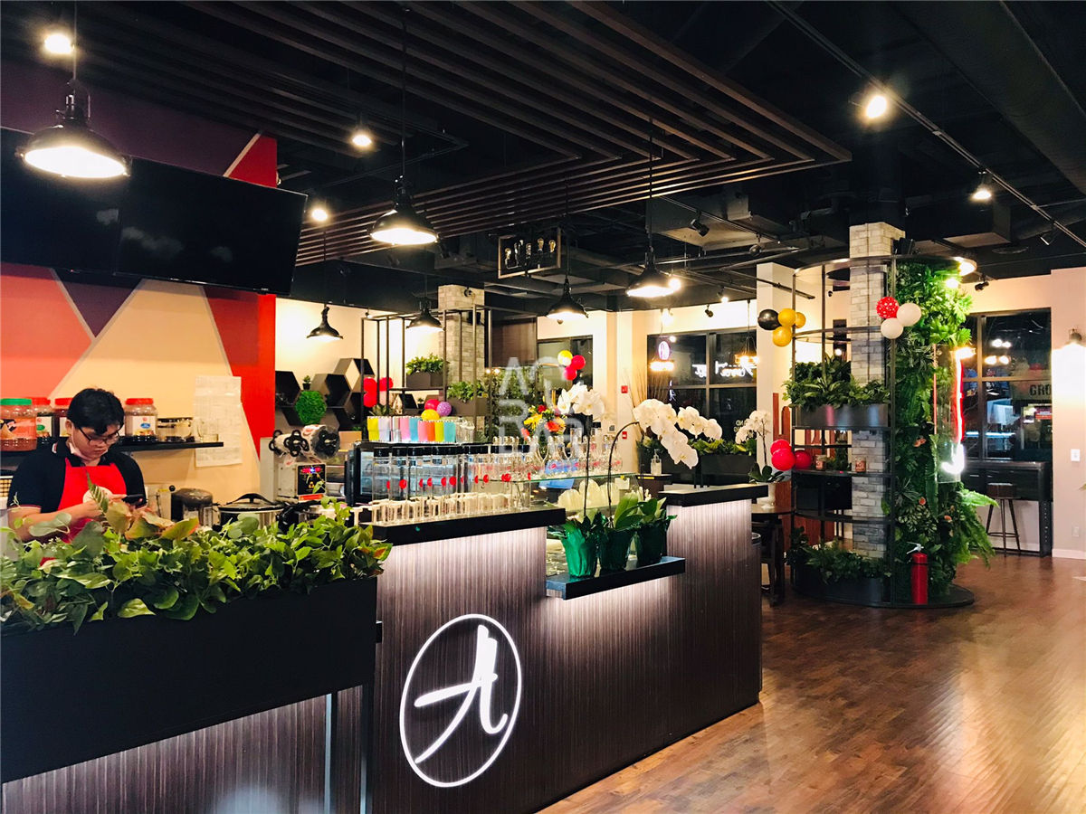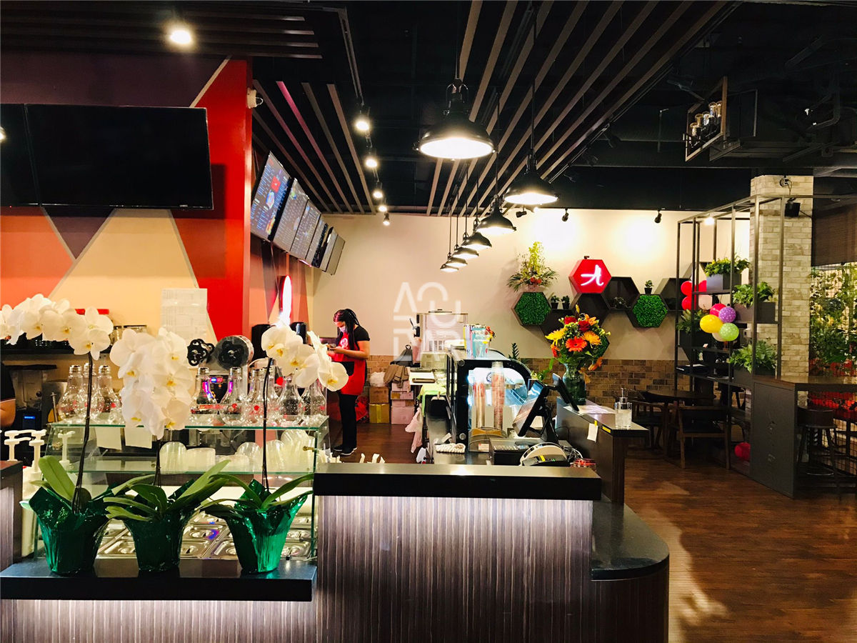 Ami Tea & Sub is a versatile hospitality brand specializing in the fusion of premium bubble tea beverages and freshly prepared submarine sandwiches, targeting a diverse, fast-paced urban demographic. Operating as a high-traffic quick-service restaurant (QSR), the brand faces the distinct challenge of integrating two separate preparation zones—one for high-moisture beverage brewing and another for fresh food assembly—within a single, cohesive service counter. In such a multifunctional environment, optimizing the circulation path is critical to managing the flow between digital ordering points and separate pickup stations, while ensuring a high-density storage system for diverse ingredients and disposables. Furthermore, the fixtures must facilitate multi-material integration of food-grade stainless steel and decorative high-pressure laminates, requiring material uniformity that withstands rigorous daily sanitation and high-wear operational conditions.