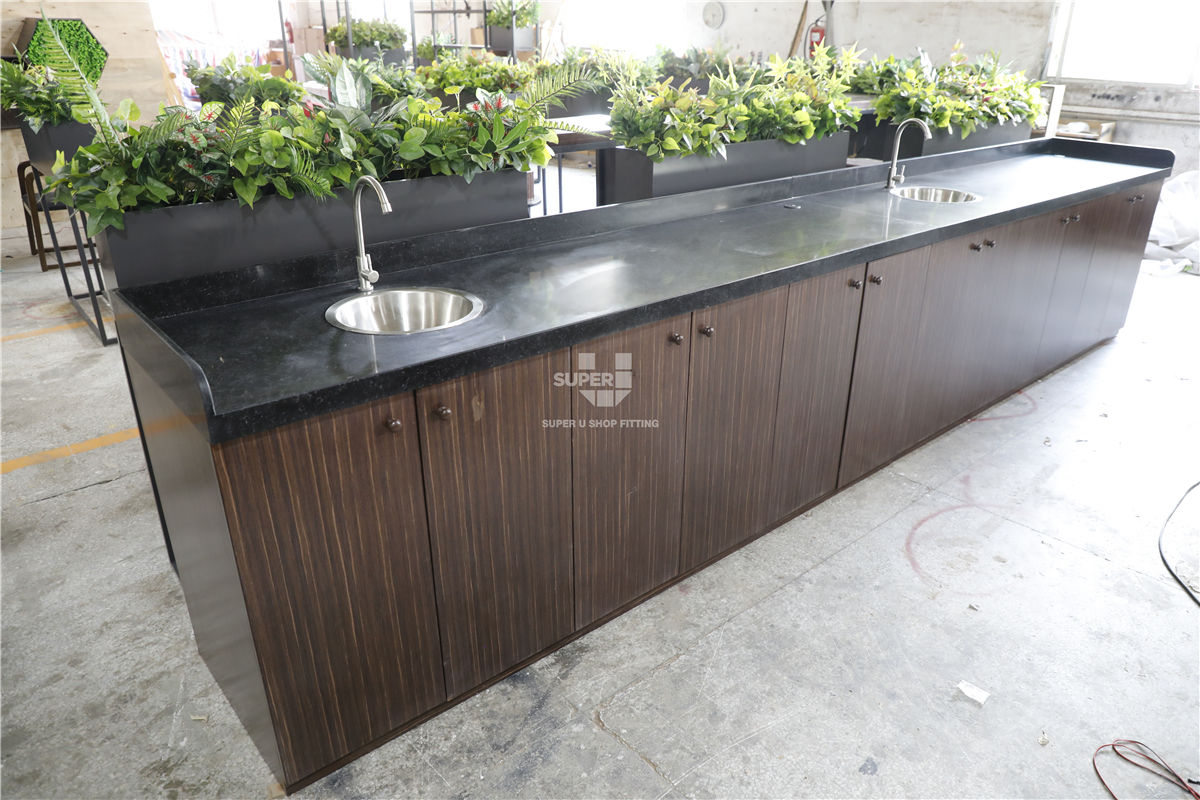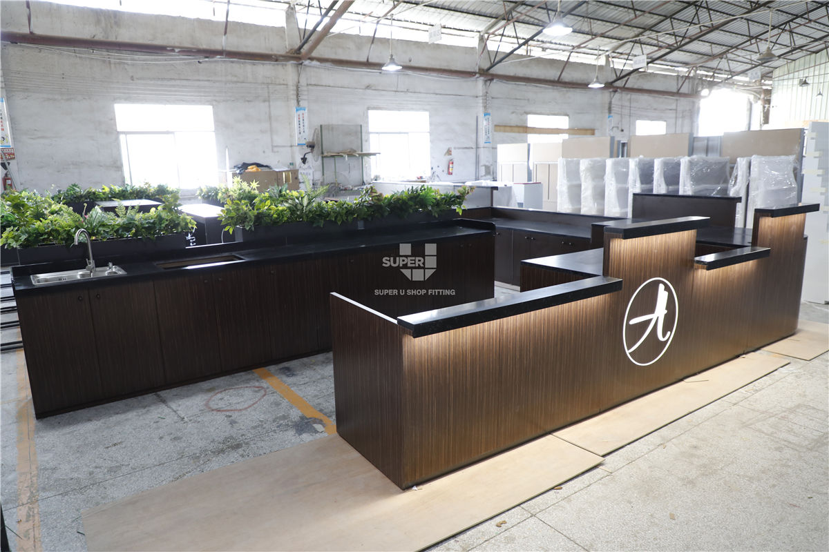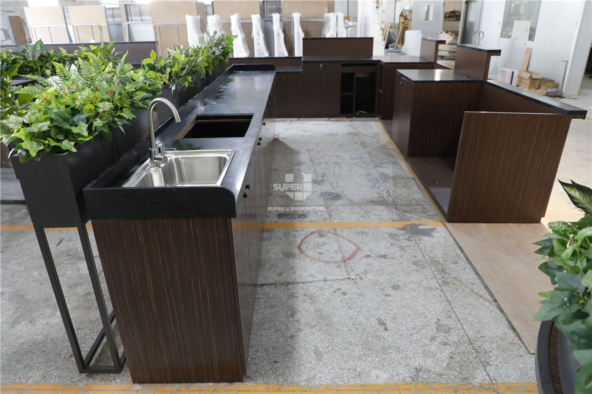 To address these technical requirements, we provided a complete furniture solution, starting with meticulous design engineering and the development of high-precision shop drawings to ensure the ergonomic alignment of the dual-service preparation lines. Our team executed a prototyping phase to validate the integration of concealed plumbing and electrical routing within bespoke service counters and modular back-bar units. During fixture fabrication, we focused on multi-material integration, combining waterproof internal structures with reinforced work surfaces specifically engineered for heavy-duty appliances. Every component underwent a multi-stage quality control and pre-shipment inspection process to guarantee finish durability and structural integrity. By managing the project from technical development through to final delivery, we transformed the space into an optimized, high-performance environment. The resulting interior features a streamlined layout and an intuitive display logic, providing a significantly more efficient operational workflow for the staff and a professional, unified brand experience for every guest.