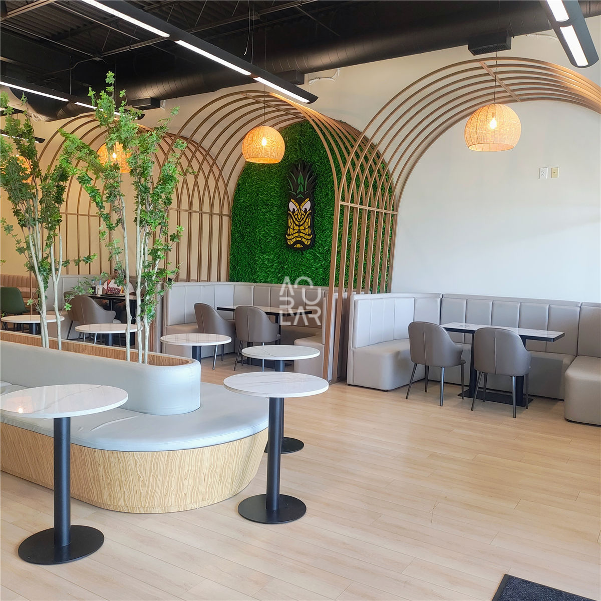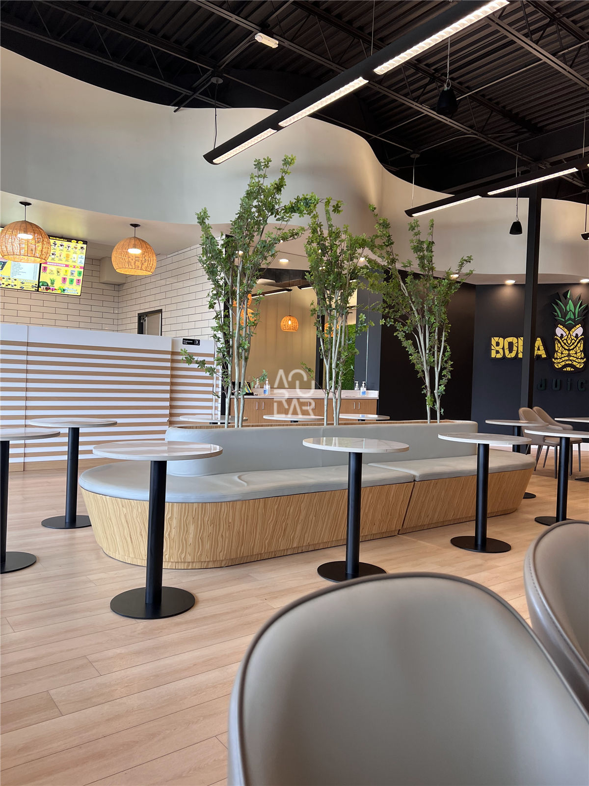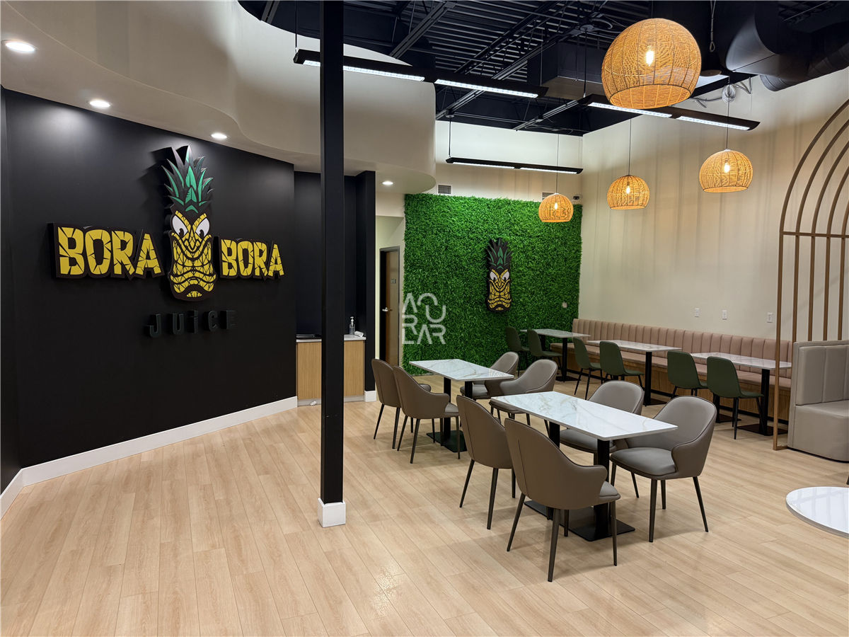Bora Bora Juice is a vibrant wellness-oriented retailer specializing in fresh-pressed juices, smoothies, and healthy snacks, targeting health-conscious consumers with a brand identity rooted in tropical freshness. Operating as a fast-paced beverage service environment, the brand faces the distinct challenge of integrating heavy-duty industrial juicing equipment and refrigeration units into a compact, high-visibility counter system. In such a high-moisture setting, the primary spatial obstacles involve maintaining material uniformity across surfaces that must withstand constant organic acids and frequent sanitation, while optimizing the circulation path to prevent bottlenecks between the ordering point and the pickup zone. Furthermore, the space requires an integrated storage system that provides high-density organization for fresh produce and disposables without disrupting the minimalist, clean brand expression. To address these operational requirements, we provided a complete technical solution, starting with design engineering and the development of high-precision shop drawings to ensure the ergonomic alignment of the prep stations. Our fixture fabrication focused on bespoke service counters and modular back-bar units, specifically engineered with waterproof internal structures and concealed electrical routing for specialized appliances. Every component underwent rigorous quality control and pre-shipment inspection to guarantee that the finish durability and structural integrity met the brand’s professional standards. By overseeing the project from technical development through to final delivery, we transformed the retail floor into an optimized, high-performance environment. The resulting interior features a streamlined layout and an intuitive display logic for grab-and-go products, providing a significantly more efficient operational workflow for the staff and a cohesive, professional atmosphere for every guest.