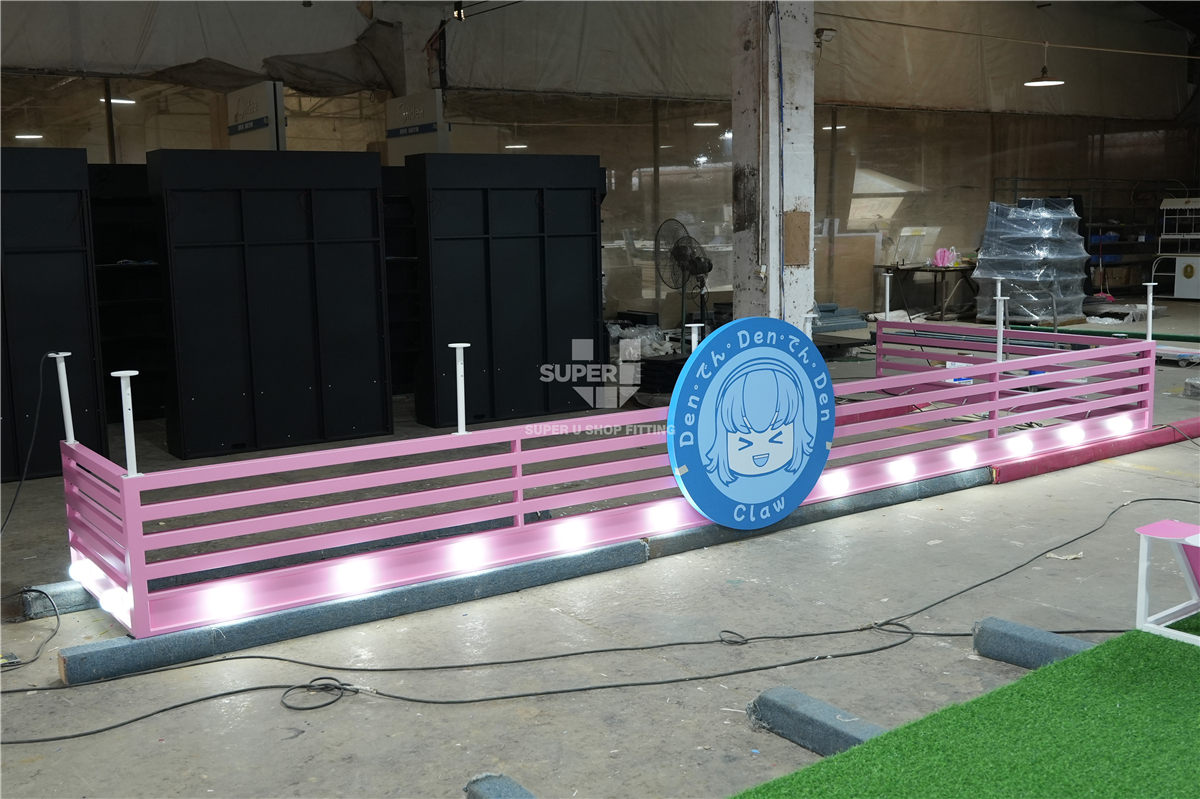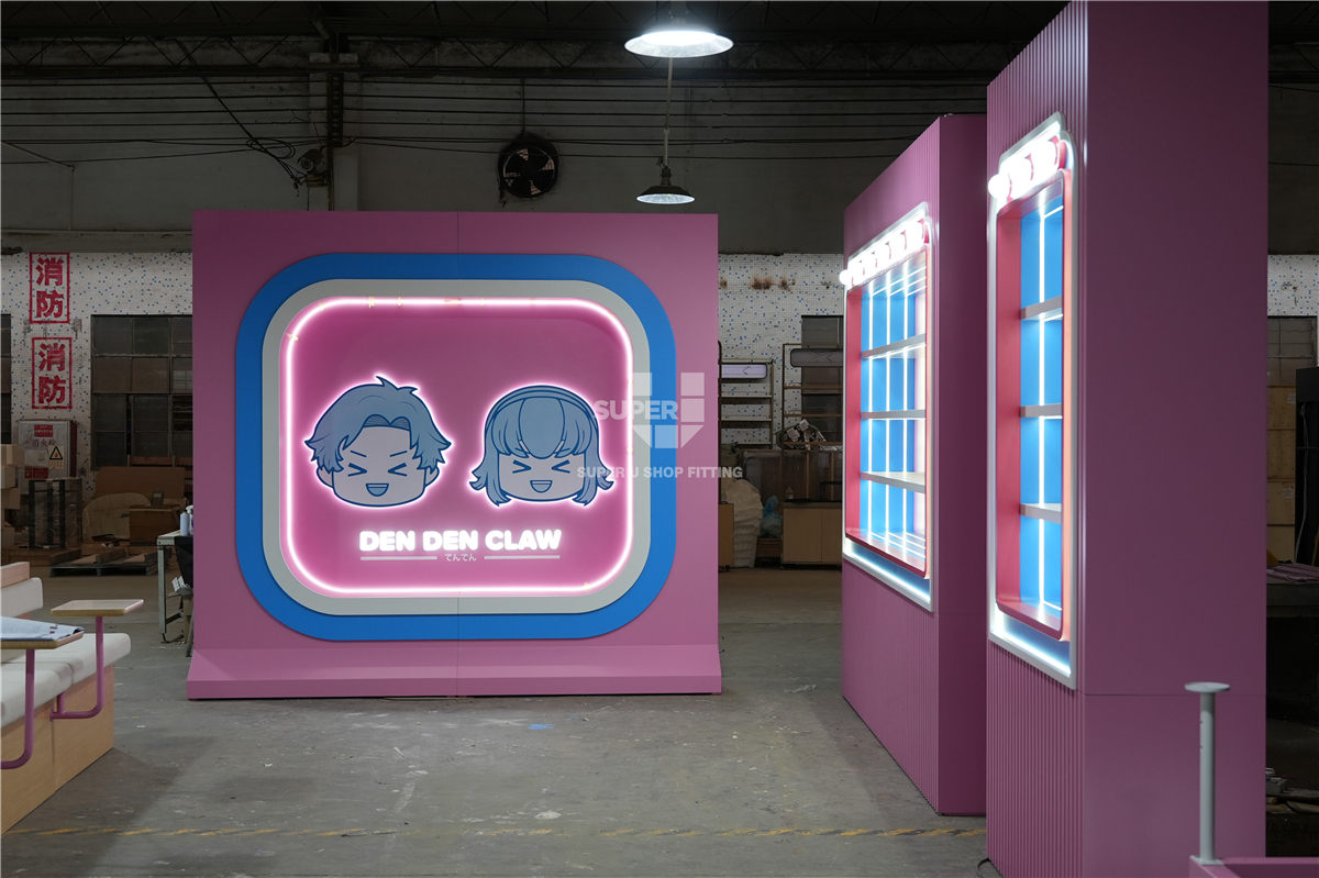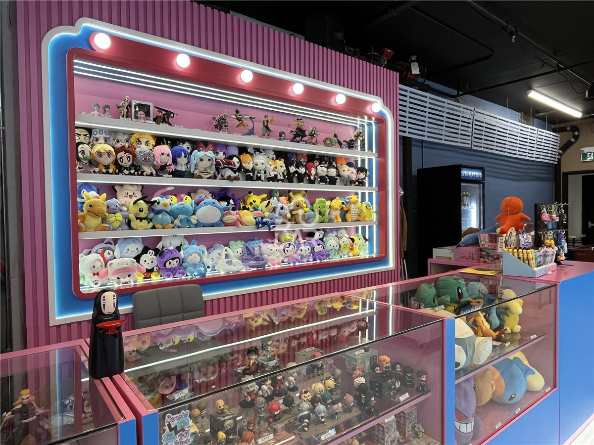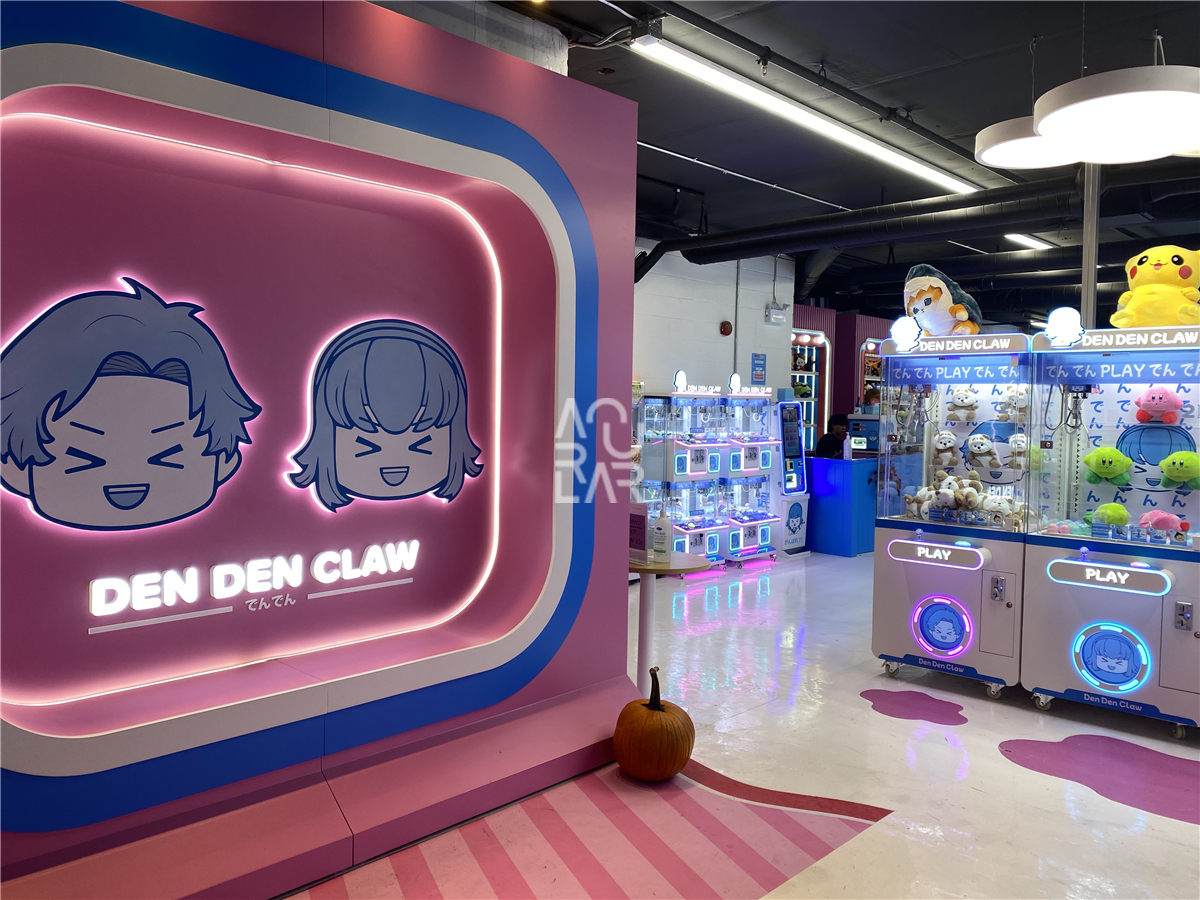 Den Den Claw is a specialized amusement center focused on Japanese-style claw machine gaming and collectible prize merchandising, catering to a young, lifestyle-driven demographic seeking interactive entertainment. Operating as a high-traffic experiential retail space, the brand’s primary spatial challenge involves the seamless integration of large-scale electronic gaming hardware with custom cabinetry while maintaining an energetic brand expression. In such a dynamic environment, optimizing the circulation path is critical to managing the flow between gaming rows and prize redemption zones, while the fixtures must maximize space utilization to accommodate a high density of machines. Furthermore, the space requires a sophisticated display logic for prize showcases and a high-capacity storage system for inventory replenishment, all while ensuring material uniformity across surfaces that must withstand high-wear, high-impact public use.