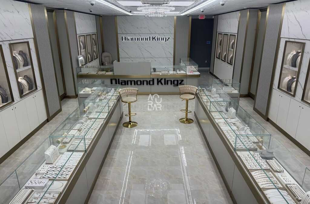 Diamond Kingz is a premier high-end jewelry retailer specializing in custom diamond pieces, luxury watches, and bespoke fine jewelry, catering to a clientele that demands exceptional craftsmanship and exclusive brand experiences. Operating in a high-security luxury retail environment, the brand’s primary spatial challenges involve the seamless integration of high-clarity display logic with sophisticated security hardware. Typically, jewelry boutiques must resolve the tension between open-concept circulation and the need for high-density, secure storage systems that remain invisible to the consumer. Furthermore, maintaining absolute material uniformity across glass, metal, and wood finishes is critical to reinforcing a prestigious brand expression, while the lighting systems must be engineered to provide precise color rendering for the brilliance of gemstones without creating glare or thermal issues within the showcases.