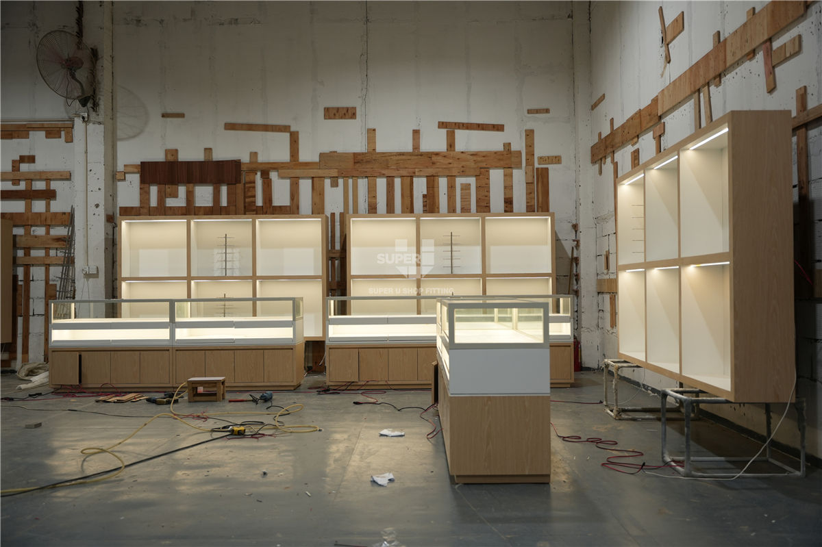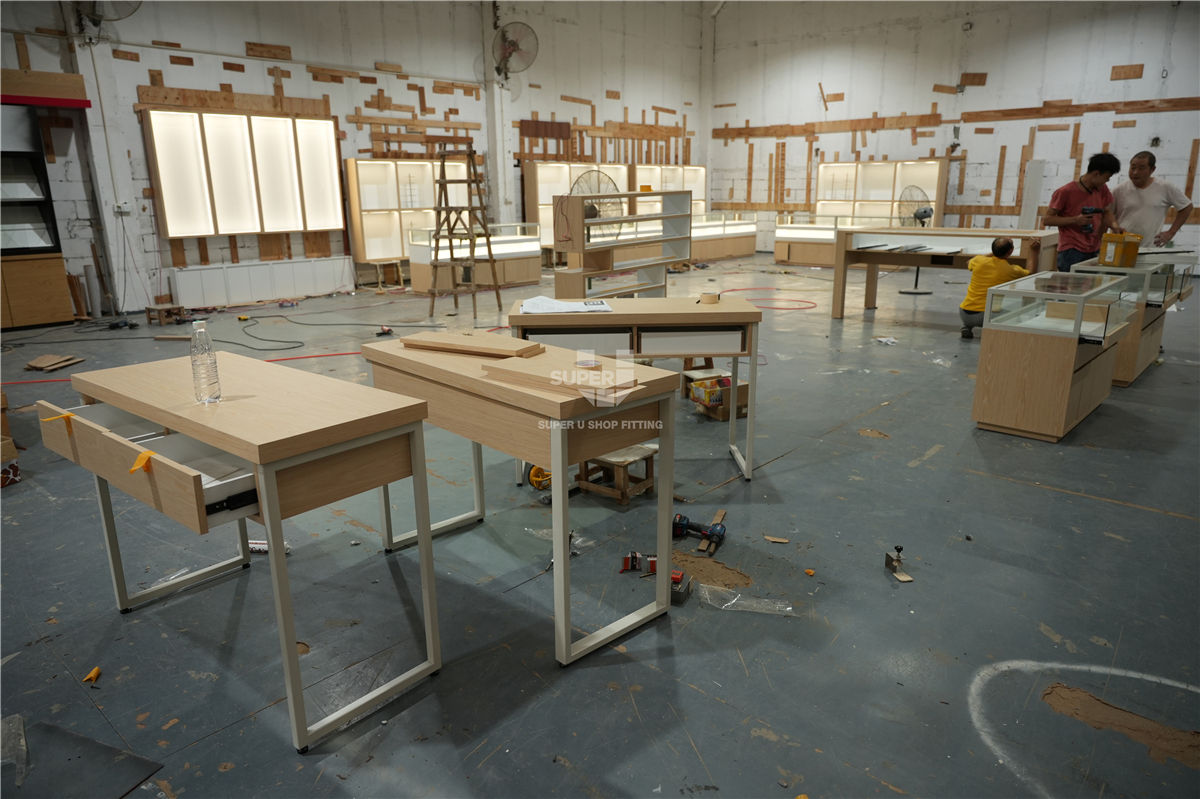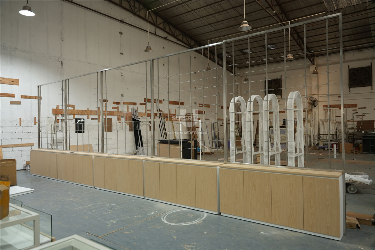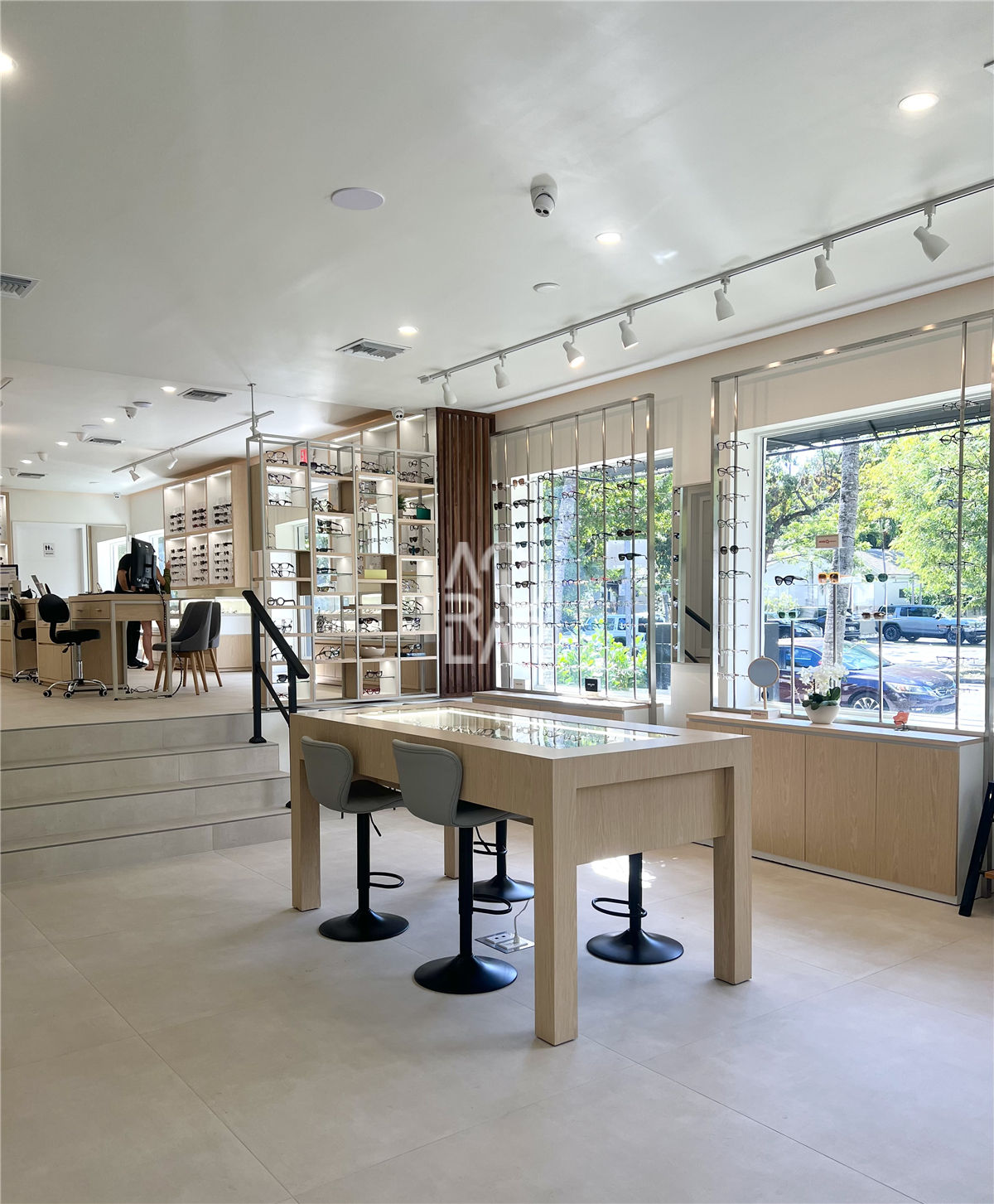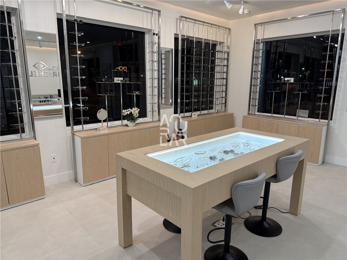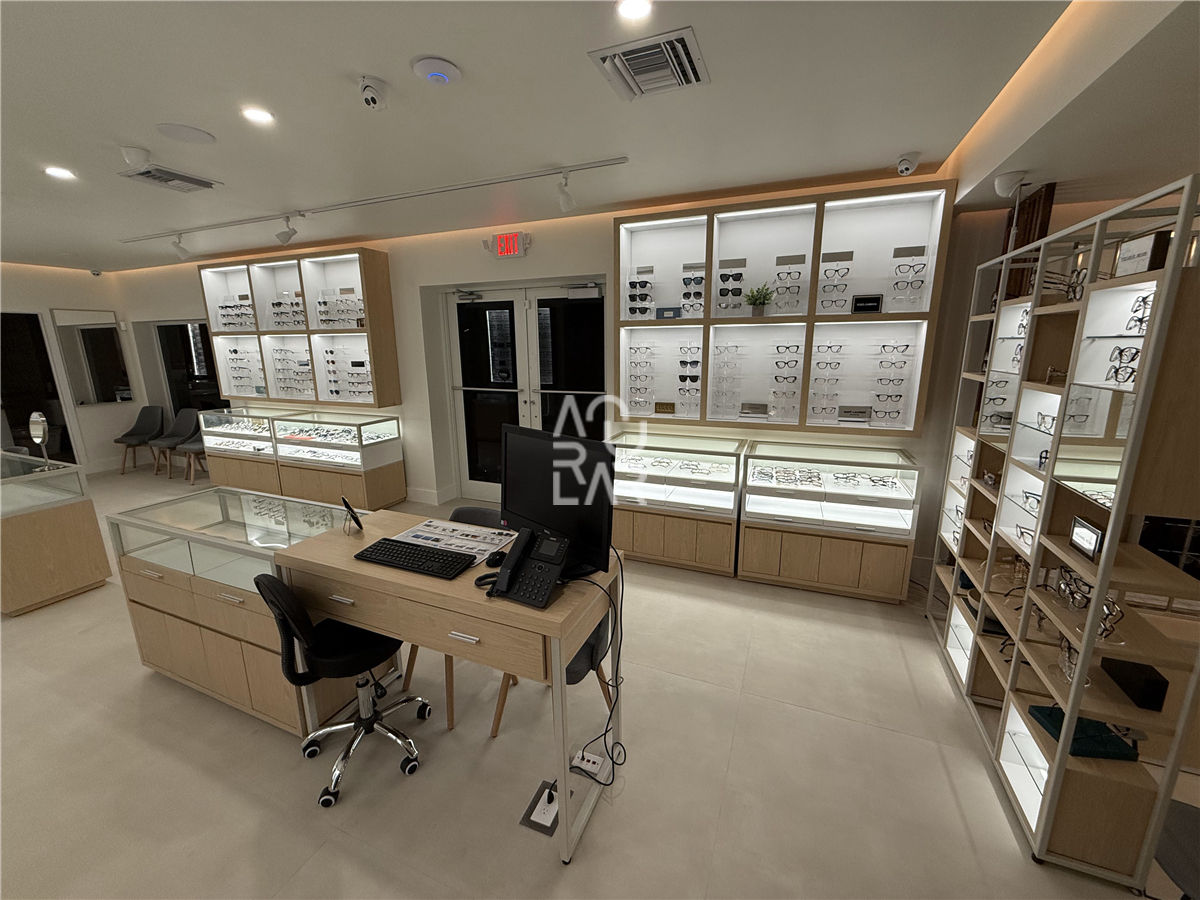 To address these requirements, we executed a comprehensive technical solution, starting with design engineering and the development of high-precision shop drawings to ensure the ergonomics of every dispensing station and display unit. Our fixture fabrication focused on modular wall-mounted systems and bespoke illuminated showcases, specifically engineered with integrated LED lighting to enhance product clarity. Each component underwent rigorous quality control and pre-shipment inspection to guarantee that the finish durability and structural integrity met the studio’s professional standards. By overseeing the project from technical development through to final delivery, we transformed the space into an optimized, high-performance environment. The resulting interior features a streamlined circulation path and an intuitive display system, providing an organized, professional experience for patients and a significantly more efficient operational workflow for the optical staff.