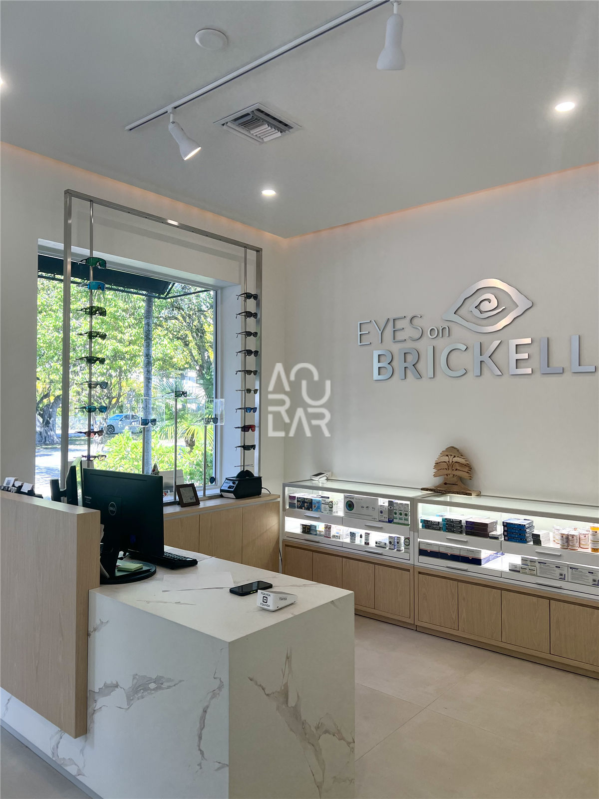 Eyes on Brickell is a premier boutique optical provider located in Miami’s vibrant Brickell neighborhood, offering a curated selection of independent designer eyewear and professional vision care. Given its urban location and high-end brand positioning, the primary spatial challenge involved maximizing space utilization within a compact, modern layout without compromising the premium gallery-like atmosphere. In such a specialized retail-clinical hybrid, the environment requires a sophisticated display logic that highlights intricate frame details while seamlessly integrating high-capacity, hidden storage systems for diverse inventory management. Furthermore, maintaining material uniformity across custom millwork is essential to ensure a cohesive brand expression that bridges the transition from the inviting retail floor to the precise examination zones.