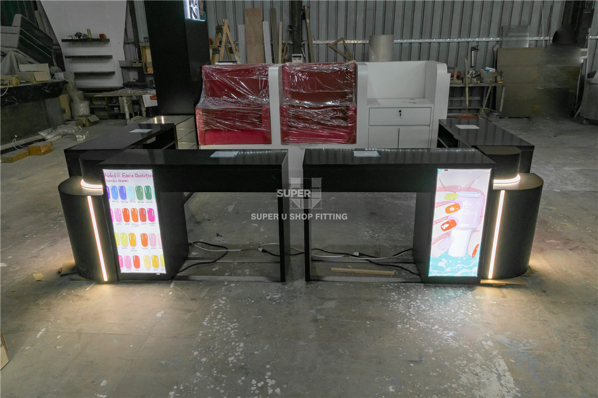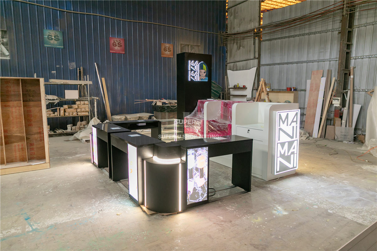 Mani Mani is a professional beauty service provider specializing in nail care and spa treatments, typically operating through high-traffic shopping center kiosks to serve urban consumers seeking convenient yet premium grooming experiences. As a service-oriented retail entity within a restricted footprint, the brand faces significant spatial challenges, most notably the need to maximize space utilization while maintaining a comfortable, non-congested flow for both technicians and clients. For a nail spa kiosk, the integration of high-density storage systems for specialized tools and pigments must be balanced with a clean, upscale aesthetic that communicates hygiene and professional care. Additionally, the furniture must withstand rigorous daily use and exposure to chemical agents, necessitating high standards for material durability and finish consistency.