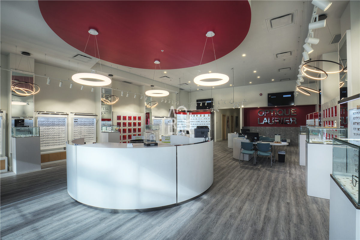 Optique Laurier is a prominent eye care provider and eyewear retailer specializing in high-quality prescription glasses, designer sunglasses, and professional optometric services. Operating as a hybrid of a clinical consultation space and a high-end retail boutique, the brand faces specific spatial challenges, primarily the need for a sophisticated display logic that can showcase a vast SKU count of delicate frames while maintaining an airy, premium atmosphere. In such a specialized setting, optimizing the circulation path is critical to managing the transition from the diagnostic area to the retail floor, while ensuring that the custom cabinetry provides a high-density storage system for lens inventory and frame back-stock. Furthermore, the fixtures must integrate precision lighting to eliminate shadows on display tiers, requiring material uniformity across glass and polished finishes to reinforce the brand’s professional medical-retail expression.