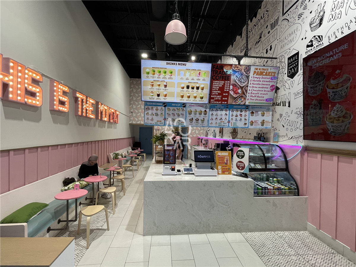 Rock N Roll is a specialized hospitality brand providing a unique frozen dessert experience, specializing in premium ice cream and artisanal treats within an energetic, theme-driven environment. Operating as a high-traffic service-based space, the brand faces specific spatial challenges, primarily the need to integrate heavy-duty refrigeration units and professional prep equipment within custom cabinetry while maintaining a clean, cohesive brand expression. In such a specialized setting, optimizing the circulation path is critical to managing customer flow from the selection counters to the point-of-sale during peak operational hours. Furthermore, the fixtures must feature high-durability finishes capable of withstanding constant thermal fluctuations and rigorous sanitary maintenance, alongside an organized storage system to facilitate rapid inventory retrieval in a compact workspace.
